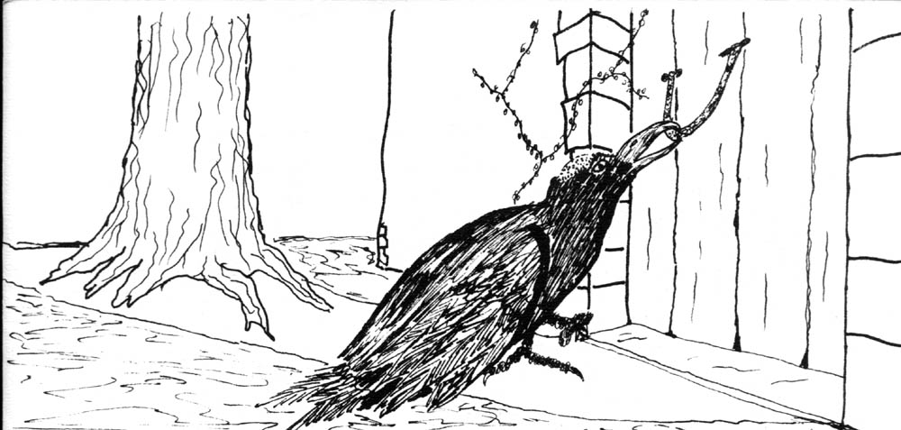 M did not answer my knock, but around back, I found a pile of ashes and cigarette buts under a tree. Suddenly an empty liquor bottle dropped out of the tree. I picked it up. Unblended highland malt. I looked up into the branches. A large dim oval shape with blond hair was smoking a pipe.