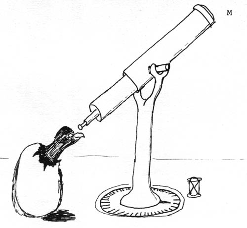I: Look. I reed you to do some drawings. (He nodded.) Maybe some photographs as well... hey, some of these oils are pretty morbid... anyway, M said you might be able to help and... you know, just something to liven up the magazine... doesn't have to be too much to the point... do some diagrams for Booty... oh yes. If you find somebody who could work as a lab assistant for Booty, that would be nice... can't pay you of course... or the lab assistant either... er, I won't be able to give you much time to do your drawings ... um .... maybe twenty or thirty minutes, most issues.