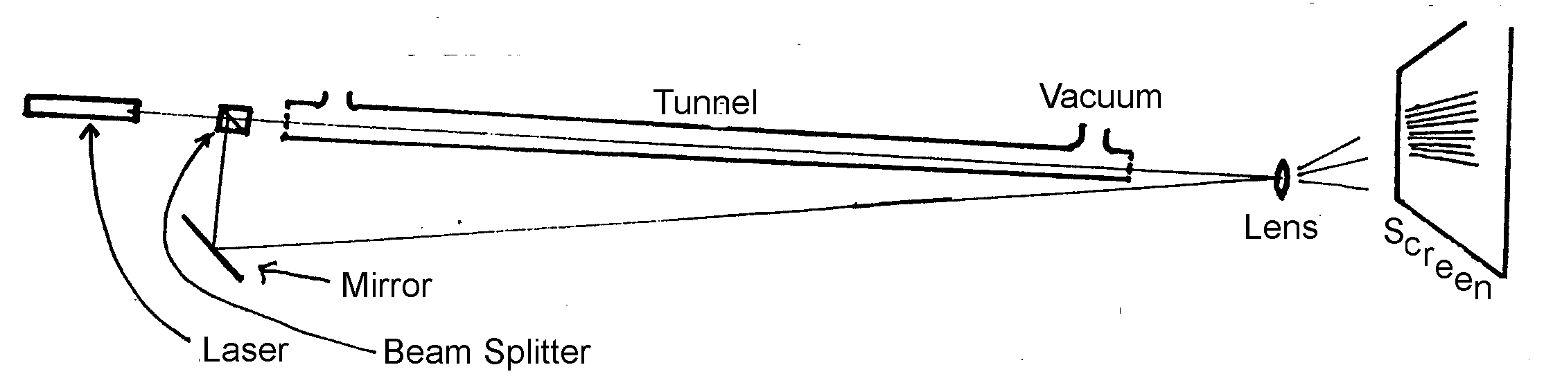 The pattern on the screen, of course, is a series of parallel red lines. The reason for the lines is that the light acts like a series of waves. Coming from a laser, the waves are very close to all being of the same length. Going from the beam splitter, there are two paths to any point on the screen; one path in the tunnel and the other beside. If the two paths are exactly the same length, any wave that arrives at the beam splitter will also arrive at that point of the screen in perfect step to add up to a bright point. If they are a whole wave length out of synchrony, they will also make a bright point. Other points will be darker as waves cancel. The resulting set of lines looks a little like red corduroy material. Since the instrument is sensitive to one wavelength of light out of about thirty feet, it is very unstable. The pattern fades out and reappears for no obvious reason. Here is a diagram of the setup;