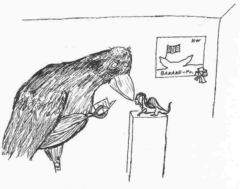 Consider the fork. The aristocrat dines with a fork. The blunt simple peasant dines with a knife, a weapon as well as a tool. He obtains his food with a knife, cutting fruit or game, and it seems natural to dine with it. On the other hand, in the arenas of ancient Rome, they used to have gladiatorial combats. One classical match was a man with sword, shield and helmet against a man with a trident and net. The trident usually won. If M goes out frog gagging, he uses a spear with three or four points, just like Neptune is pictured. You see, a frog or a fish below the surface will not lie exactly where it seems to, because the light is bent as it passes the surface. So you stand a better chance to hit it if you use a trident; the trident strikes three times with each blow. The farmer with his pitchfork is a symbol of bucolic tranquillity and peace, but the farmer has a small kingdom to defend all by himself. Given all the machinery of a farm to choose from, he is likely never to let his pitchfork get too far away from him. On a larger scale, the "TRIDENT" nuclear missile carries multiple warheads; it strikes many times for one launch, turning the balance of power terribly toward the offensive move. If that doesn't seem like enough trouble, consider the devil. What does he arm himself with? A fork. The fork is the ultimate weapon. It is the table utensil of the power elite. The American will leave his knife clean while he cuts his meat with the edge of the fork, only relinquishing the fork from his right hand long enough to get very difficult cutting done. Then down goes the knife, and the fork goes again to the weapon hand.