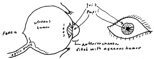 The anatomy of the eyeball is about like this: Its overall shape is due mostly to a tough shell of fibrous tissue. In front, after passing the eyelids, light enters a film of tear fluid. Just beneath the tear layer is the tough clear cornea. Behind the cornea is the colored iris with the central opening called the pupil. Behind the iris is the crystalline lens. Between the lens and the cornea the space is filled with a liquid called the aqueous humor. The space behind the lens is filled with a transparent gel called the vitreous humor. On the back wall, behind a network of blood vessels, lies the retina with its rods and cones. Right in the center, where vision is sharpest, there is a shallow pit packed with cones and free of blood vessels, the fovea. (The angle of the wall of the pit makes the effective diameter of each cone smaller. Hawks, with their great visual acuity, have very deep pits.)