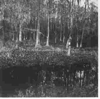 We were passing now through an open swamp, populated by soaring cypress trees whose wattled trunks were several feet thick and placed fair~y far apart, so that one could see a good distance -maybe a hundred feet, or two hundred feet off into the surroundings. There were also oak trees, a few very large ones but most hardly thicker than your forearm, and I noticed also some ironwoods standing gaunt and solitary surmounted by a scraggy fringe of crooked little branches. There were also various densities of bushy plants, whhich more than once closed across the streant so that we had to push through them, or hold branches back, passing them from hand to hand so they wouldn't snap into the face of the person behind. Carlisle, our mother and I were in the lead canoe, with Marshall and Linda behind.