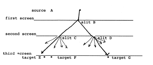 Another experiment I should like to know about is this. Suppose you close the slit at D. That destroys the diffraction pattern. But when? Assume we are dealing with light, not electrons. The fastest a signal can travel is at the speed of light. So closing the slit at D cannot make a change at target F until at the soonest light has had time to go from D to F. Otherwise we have a faster-than-light telegraph. But is the time lag the time for light to go from D to F or from D to C to F or from D to B to C to F? And when using electrons, how fast does such a signal go? What kinds of track do you see in a local cloud chamber in any one area while the signal is in transit? What kind of pattern on the third screen do you get while the signal is in transit?