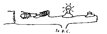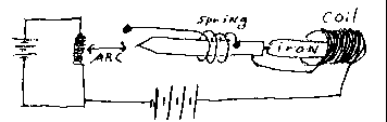 Next, consider that at the moment we turn the machine on, the electromagnet is off, the spring hold the anode against the cathode, resistance to flow is nil, flow is infinite and the whole thing heats up and melts, unless we were clever enough to put in a fuse, in which case only the fuse melts. We take care of this by putting a resistor in series with each anode thus: (I used a light bulb when I did it.)