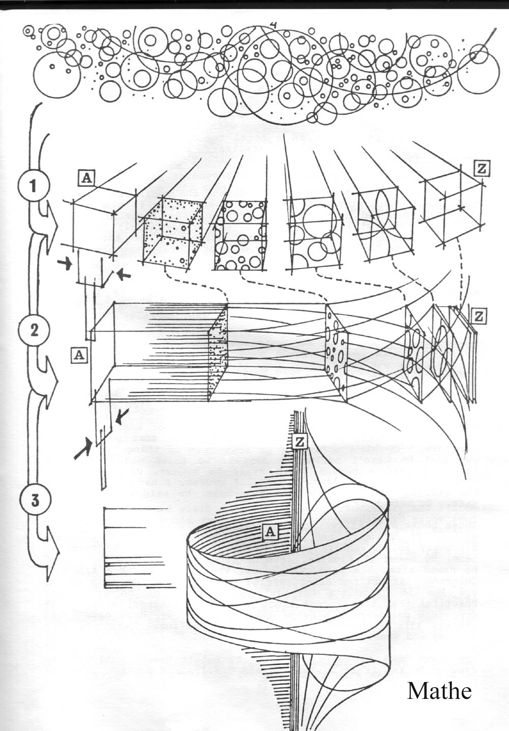 Varying complexity is indicated by spheres of varying size. Space is absolutely divided into points in A and absolutely unified in z. Dividedness and unification are complementary aspects of space. Between the homogeneous states of A and z space is granular' in varying degrees. This model completely fills and completely defines space. It is assumed that the concept of space cannot be anything less.