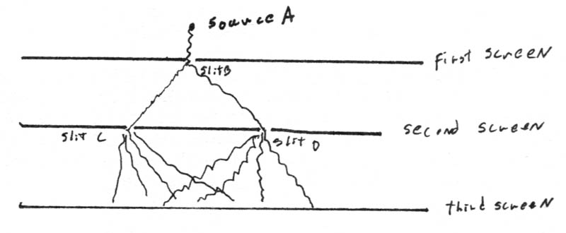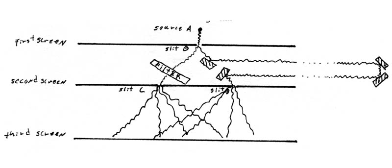 There is another experiment that could be done. One of the watchwords of quantum theory is, "It doesnrt exist until it is measured." For instance, if a photon has gone through slits at B, then through stilts C and D and is now producing a diffraction pattern on the third screen, you can't tell whether that photon actually went through C or through D. If you put a measuring device at C or P, the presence of the device will destroy the diffraction pattern. Ah, but if a gate at slit B was opened and closed, so you know when the photon started, and if the distance along path B, D screen three is different from the distance B, C, screen three, and if you know when the photon arrives at the screen three, then you know which path it took.